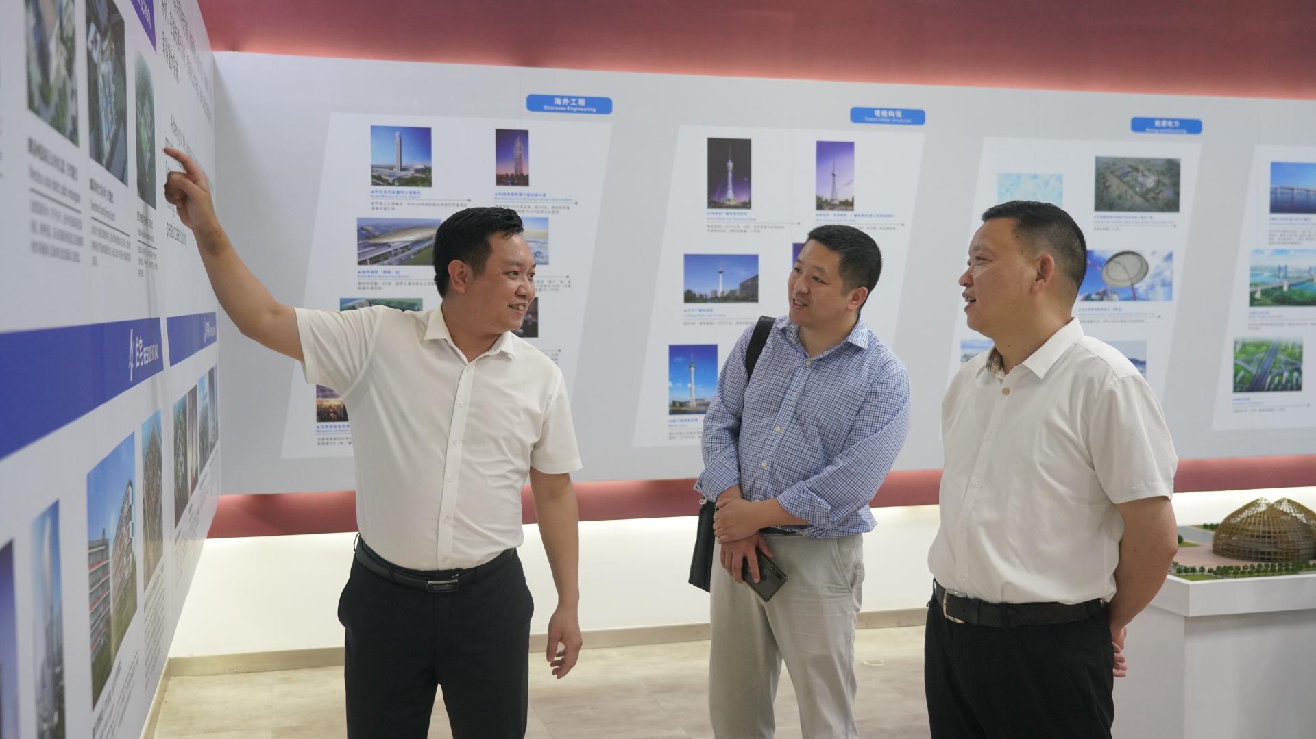 调研团一行先后参观了蔡甸城市客厅项目部、大区陈列室和钢结构制造厂,观看了中建科工企业宣传片、湾区会展国际酒店项目纪录片。
