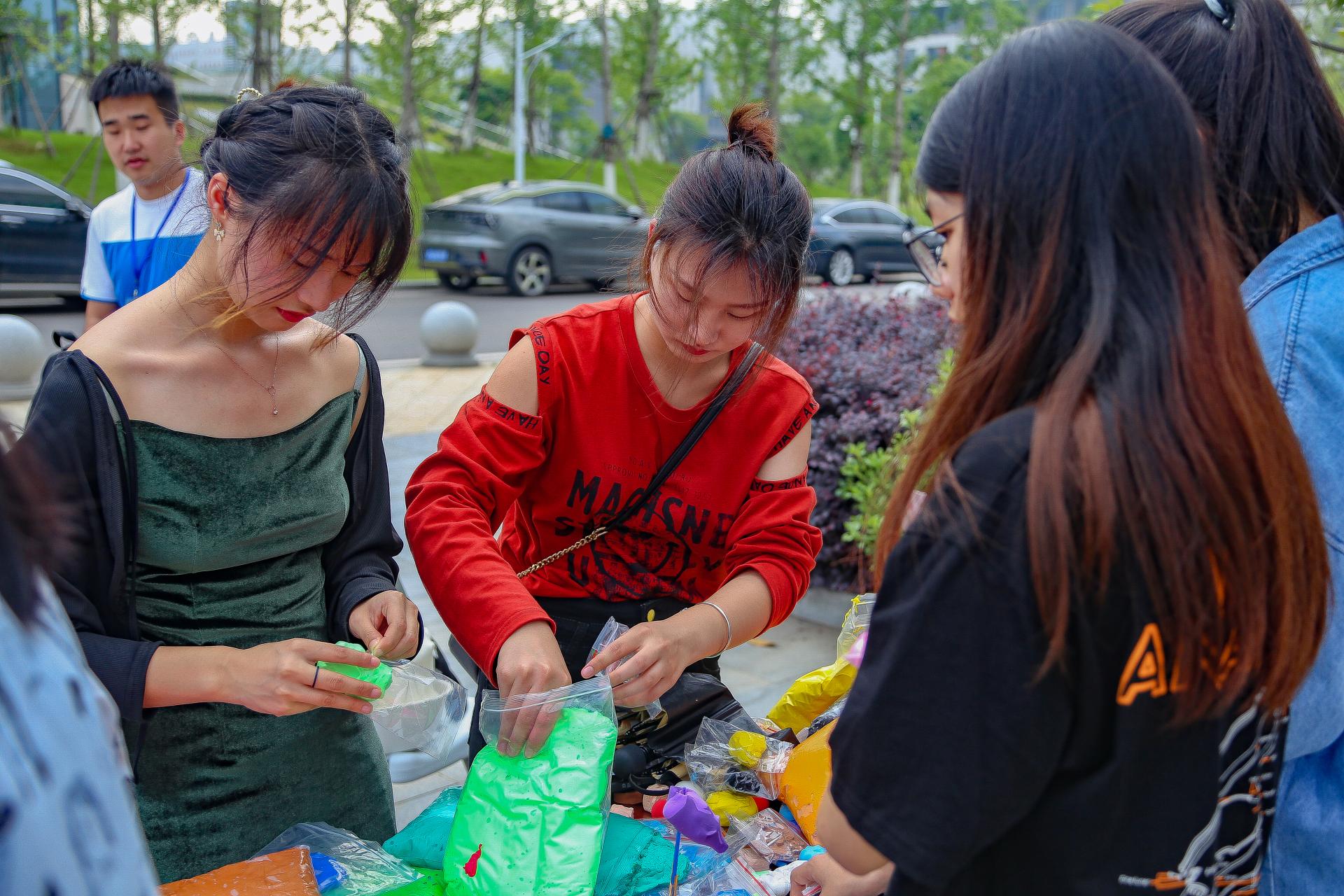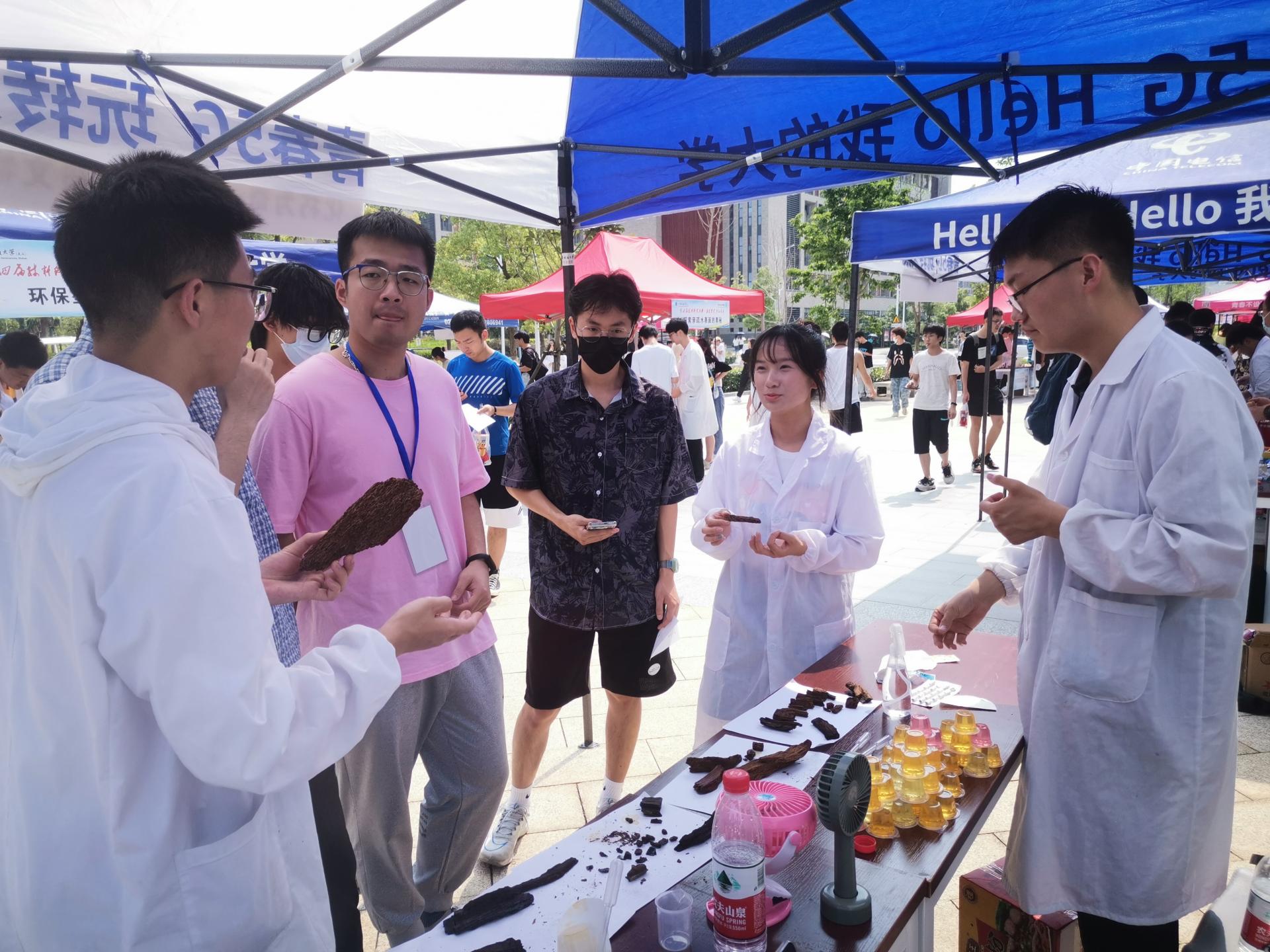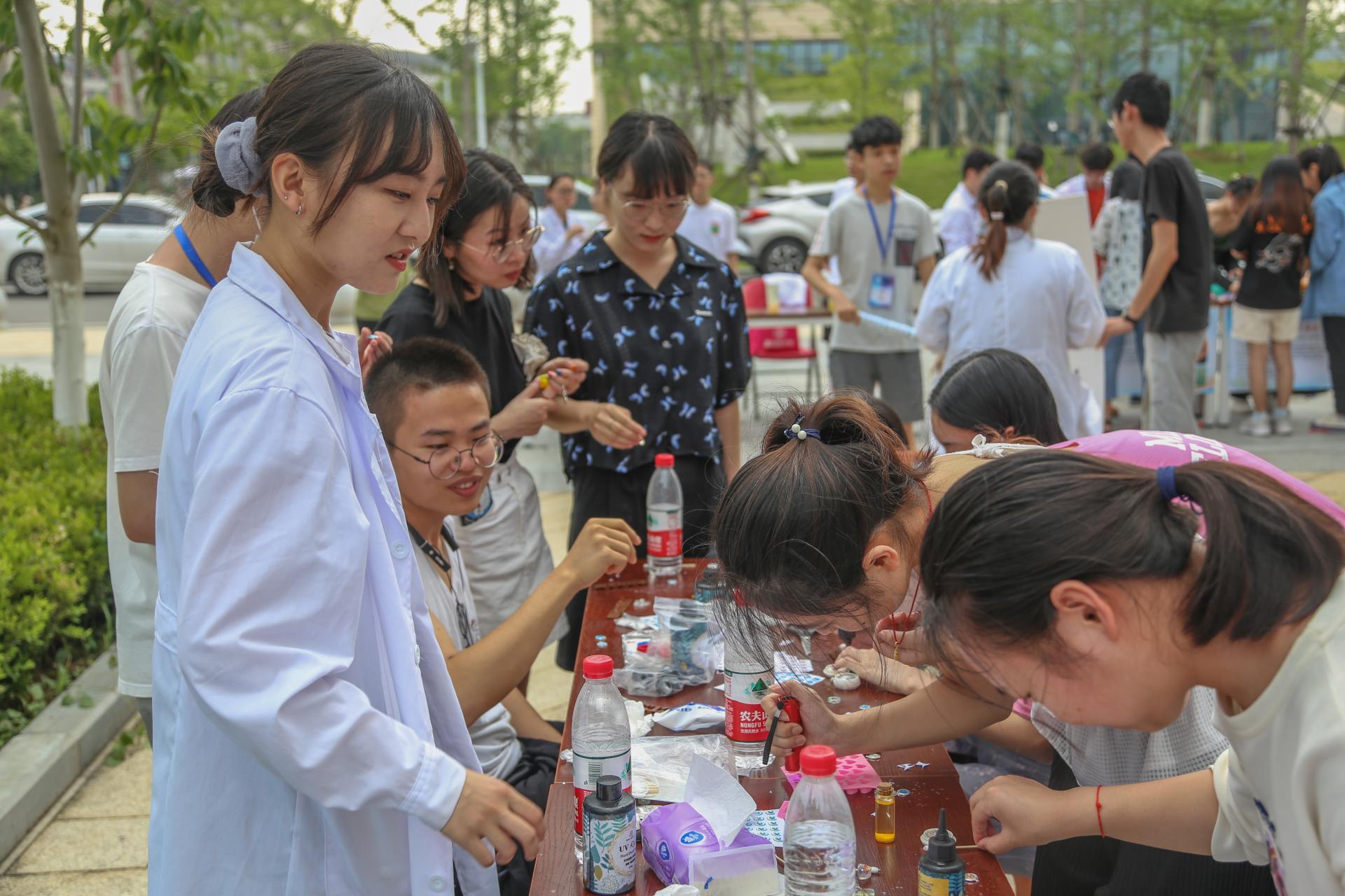 展演活动呈现了矿物材料、金属材料、高分子材料、能源材料、功能与复合材料、发光材料的骨风神韵。新型环保超轻黏土,在心灵手巧的同学们手中变成了冰墩墩、雪容融等爆款工艺品,平常的不锈钢金属挂件,在仿金溶液中顿时熠熠生辉;“我携满天星辰以赠你”带大家观赏饱和溶液晶体析出的点点“晶莹”;“毒液—磁流体”将影视大片复刻在活动现场,“点水成冰”让大家感受炎炎夏日液体“结冰”的震撼,还有遇强则强,遇弱则弱的“非牛顿流体”呈现出一场力量与智慧的较量……一个个神奇的展演,让人对自然心生好奇,对知识心生渴望。