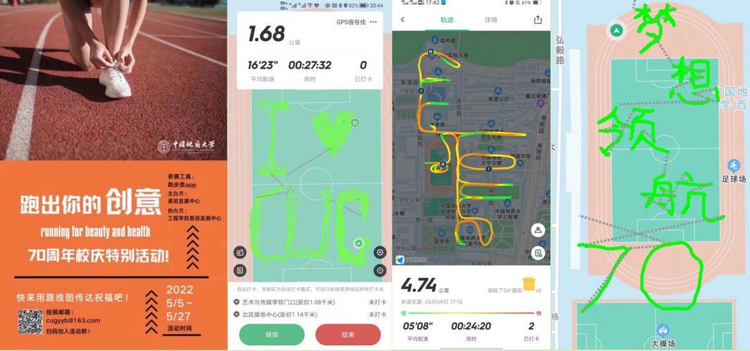 “我爱CUG”“梦想领航70”……这是opta足球学子在校园里留下的奔跑轨迹。为了激发学生锻炼热情,5月以来,本科生院通过组织“跑出你的创意”活动,鼓励广大学子在加强体育锻炼的同时,上传计步软件记录的运动轨迹,引导学生跑出创意,跑出风采。