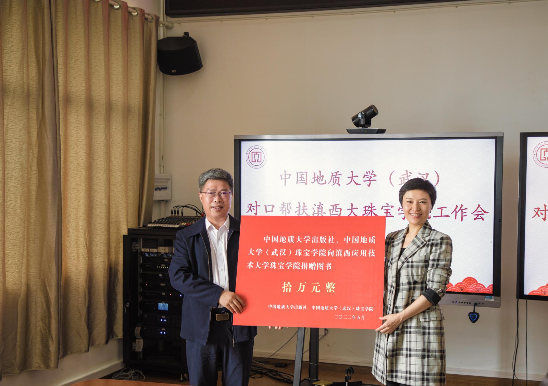 王华代表学校,向滇西大珠宝学院捐赠了价值10万元的图书。