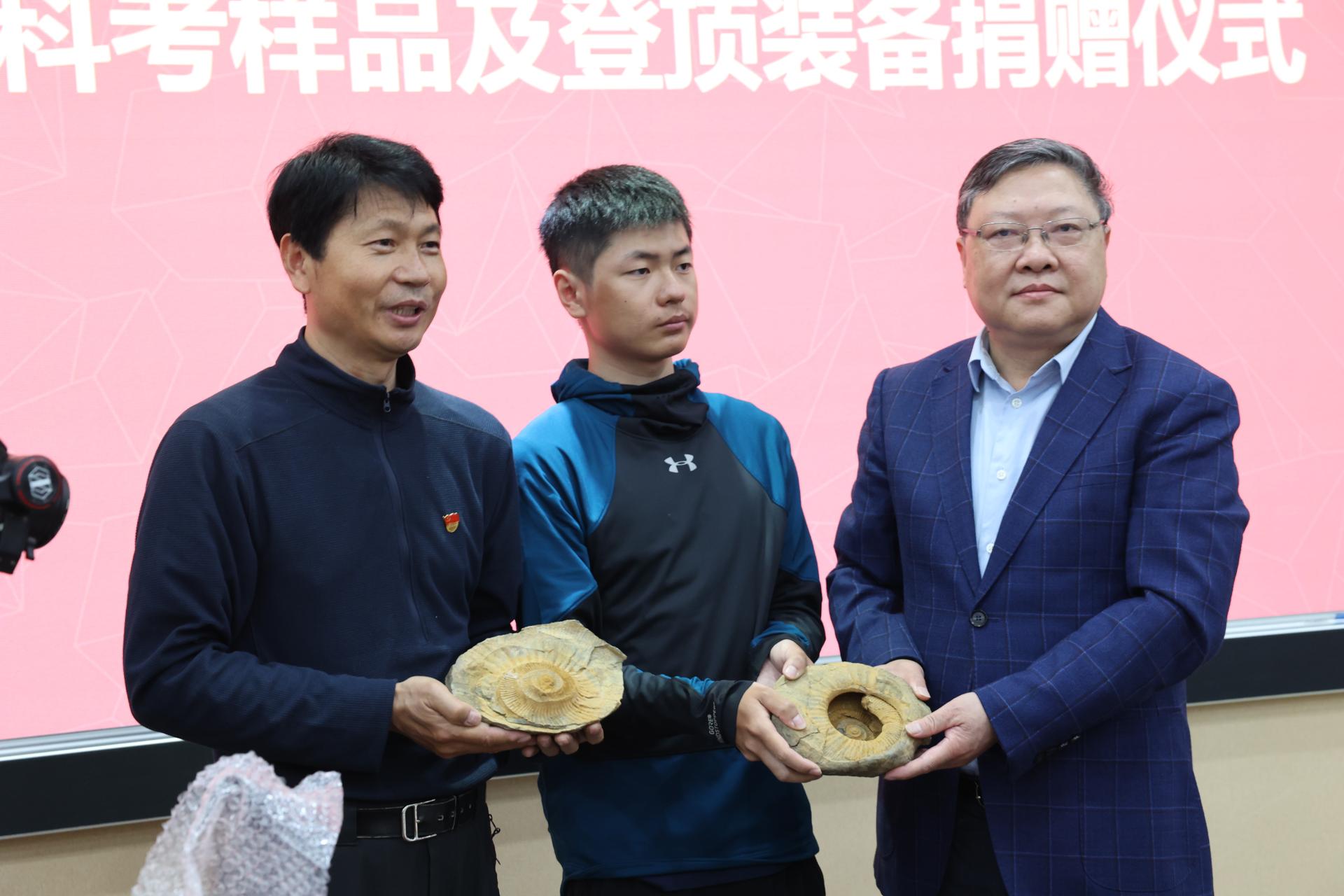 储祖旺代表学校接受陈刚教授珠峰科考登山捐赠物品。此次陈刚捐赠的物品包括珠峰科考标本样品7样、登顶珠峰纪念物品2类、攀登珠峰影像资料2类和登顶珠峰邮政纪念品1类。