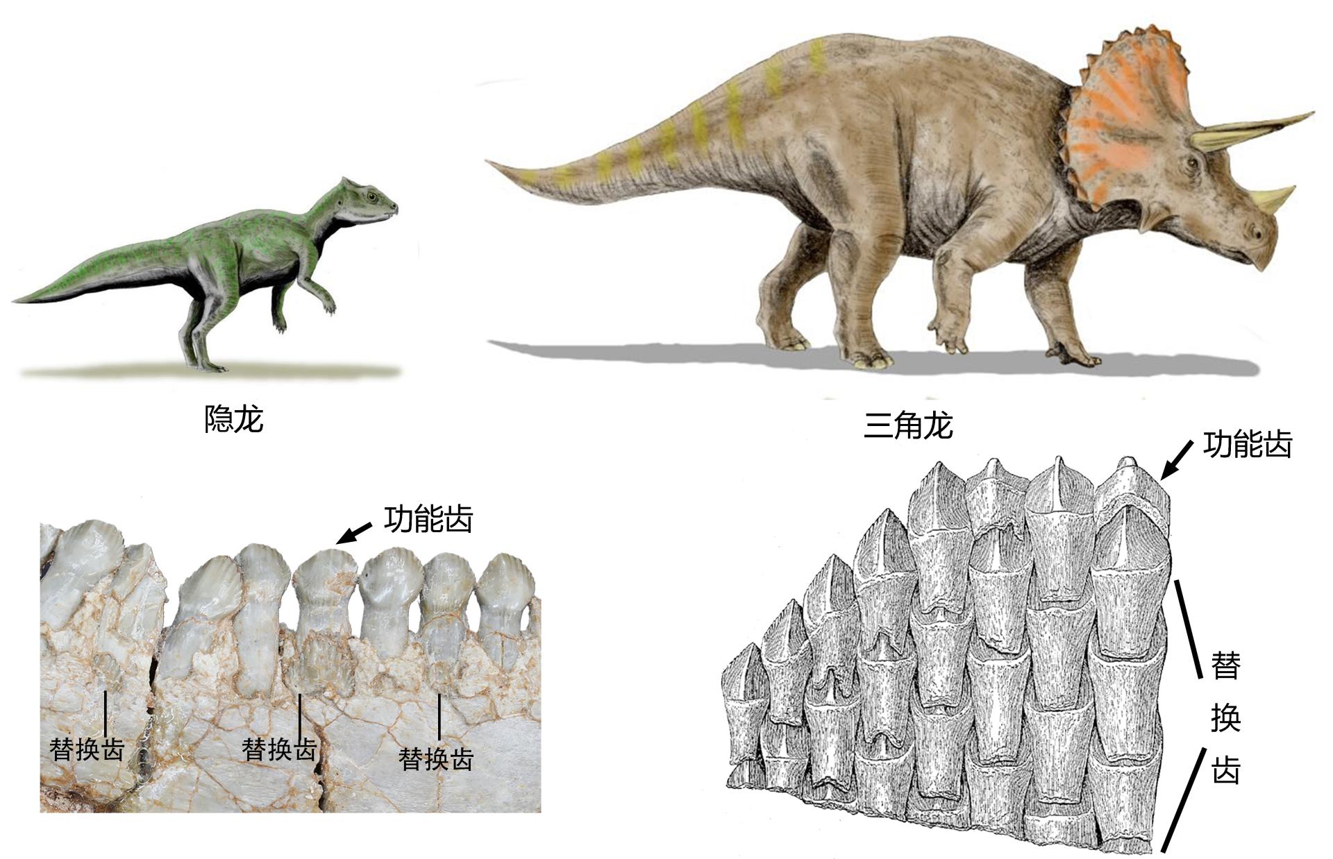 这一系列的研究,最终揭示了最古老角龙类换牙的秘密:早期角龙类有着极少的替换齿数量,说明早期角龙不同于晚期出现的三角龙,换牙频率较慢,并且早期角龙类新牙生长的位置也不同于三角龙,三角龙中新牙从旧牙的底部长出,而早期角龙类中新牙从旧牙的内部长出(图1-3)。