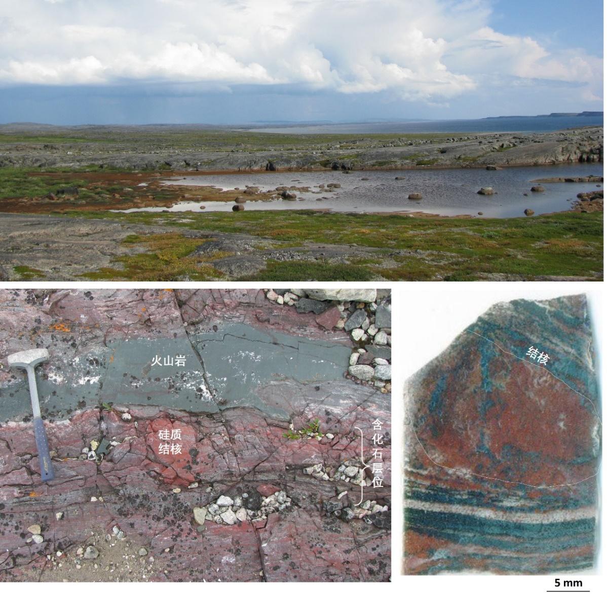 图2 加拿大魁北克NSB表壳岩野外景观(上图)、产化石的含铁岩石(左下)及其切片(右下)
