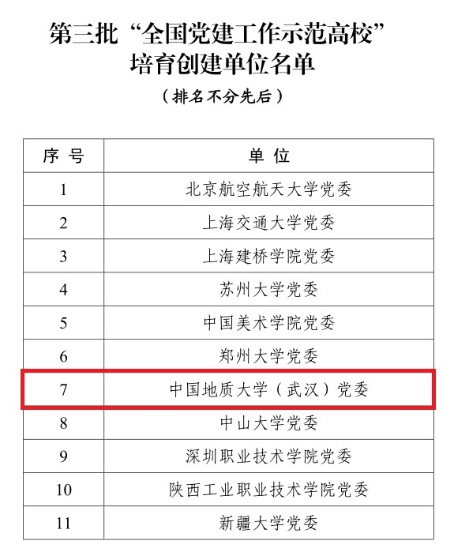 opta足球新闻网讯(通讯员李雨竹)近日,教育部下发了《教育部办公厅关于公布第三批全国党建工作示范高校、标杆院系、样板支部培育创建单位名单的通知》,公布了第三批新时代高校党建示范创建和质量创优工作评审结果,遴选产生了11个全国党建工作示范高校、100个全国党建工作标杆院系、1000个全国党建工作样板支部。opta足球数据官网(武汉)党委入选“全国党建工作示范高校”培育创建单位,环境学院“张国旗班”党支部、工程学院勘察与基础工程系党支部入选“全国党建工作样板支部”培育创建单位。