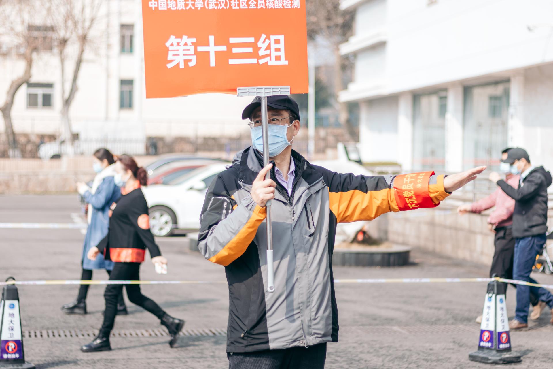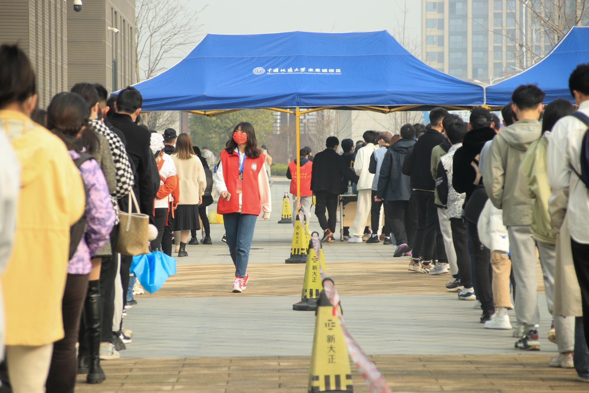 3月4日,未来城校区全员核酸检测现场,学生志愿者在维持现场秩序。 龙心滢摄