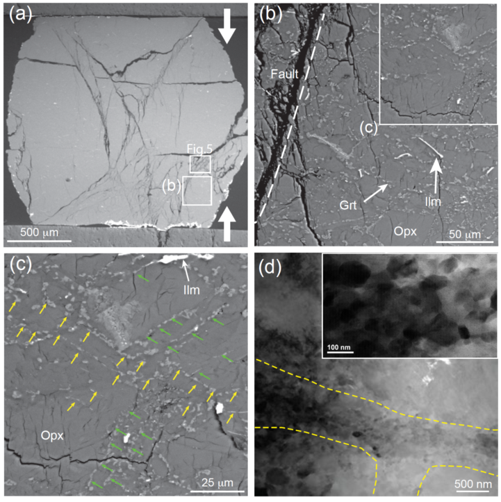 史锋等通过美国阿贡国家实验室高等辐射源(APS)同步辐射D-DIA仪器及声发射装置,对地幔岩石圈主要组成岩石方辉橄榄岩的主要组成成分斜方辉石的流变学特征,进行了系统实验研究。研究结果表明,斜方辉石作为地幔岩石圈主要组成矿物之一,在变形过程中颗粒边界和颗粒内部会发生变质反应,在俯冲带温压条件下产生超细粒细粒的石榴子石,诱发岩石失稳,可能是造成中源深地震活动的双地震带下地震带地震发生的物理机制。