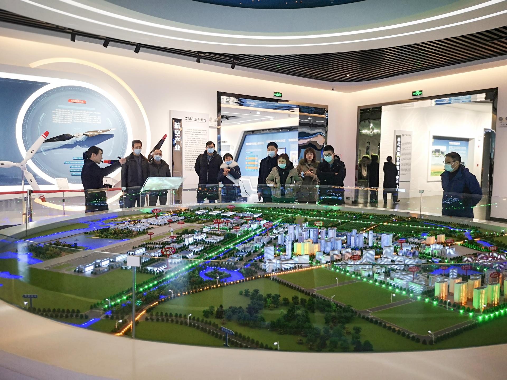鸠江区政府副区长冯中陪同瞿祥华一行参观芜湖市产业创新中心,工作人员为老师们介绍了各类技术创新成果。