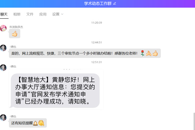 opta足球新闻网讯(通讯员张磊)“网上流程规范、快捷,三个审批节点一个多小时就办结啦,感谢各位老师”“还有短信提醒呢”近日,在学校办公室组建的“学术动态工作群”里,工程学院黄静老师得知她在网上服务大厅提交的学术海报申请被快速受理后,按捺不住内心的喜悦,一连在QQ群里发了好几条信息。