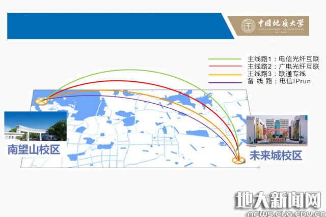 两校区直线距离22公里,将两校区连接起来的光纤至少40公里。超长的距离、途经多个光交箱,还有市政施工等都给光缆的稳定运行增加了许多不确定因素。基于此,信息化办的同志又加装了一条稳但不快、一条快而不稳的两条主线和一条只保核心业务的备线,创新性地实现了三主一备、线线不同、性能互补的互联方案,且新增的线路费用只比原线路多出了60%。三主一备开通后,跨校区网络互联稳定性大大提升,仅在今年上半年因市政施工一次性断过2根主线,但两校区互联至今未曾“断线”。