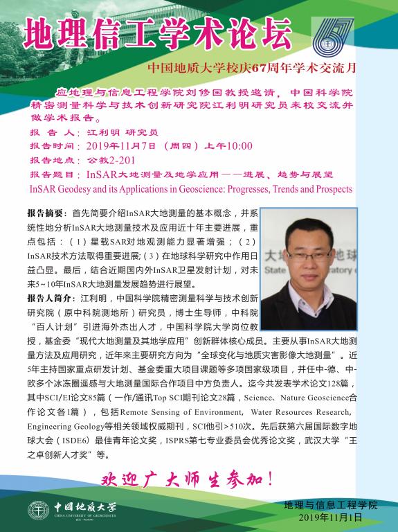 [11月7日]地理信工学术论坛:中国科学院精密测量科学与技术创新研究院江利明研究员学术报告