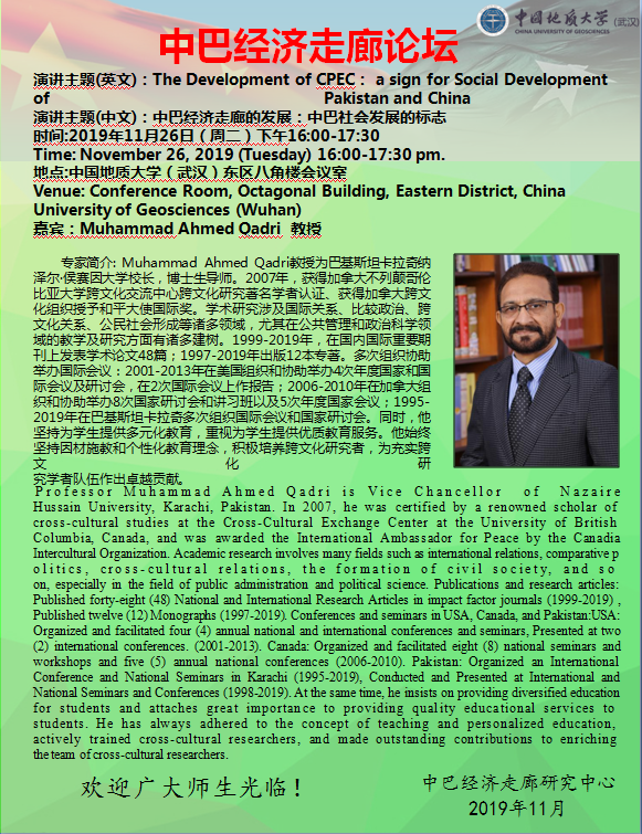 [11月26日]中巴经济走廊论坛:巴基斯坦卡拉奇纳泽尔·侯赛因大学校长Muhammad Ahmed Qadri教授学术报告