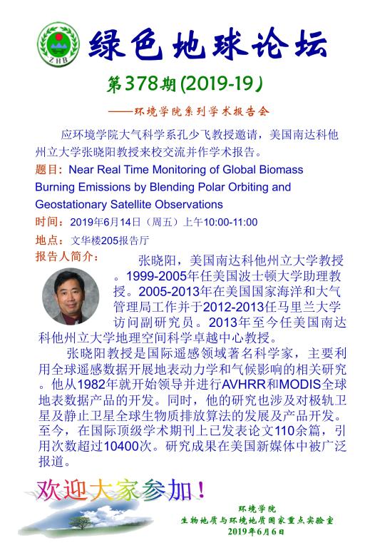 [6月14日]绿色地球论坛:美国南达科他州立大学张晓阳教授学术报告