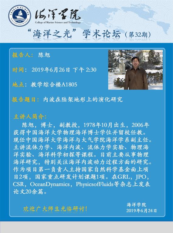 [6月26日]“海洋之光”学术论坛:中国海洋大学海洋与大气学院海洋学系副主任陈旭副教授学术报告