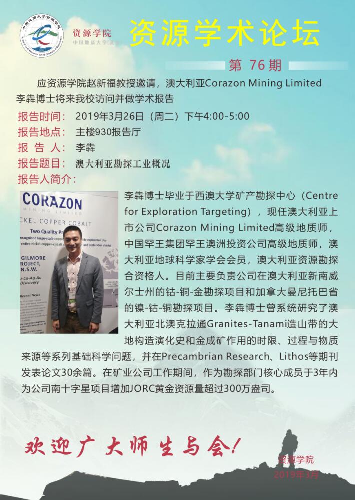 [3月26日]资源学术论坛:澳大利亚Corazon Mining Limited李犇博士学术报告