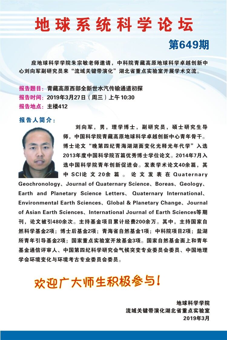 [3月27日]地球系统科学论坛:中科院青藏高原地球科学卓越创新中心刘向军副研究员学术报告