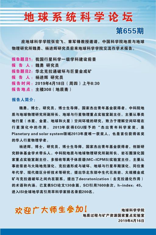 [4月18日]地球系统科学论坛:中国科学院地质与地球物理研究所魏勇、杨进辉研究员学术报告