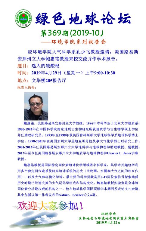 [4月29日]绿色地球论坛:美国路易斯安那州立大学鲍惠铭教授学术报告