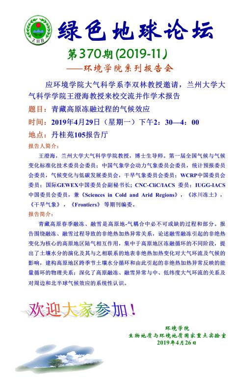 [4月29日]绿色地球论坛:兰州大学大气科学学院王澄海教授学术报告