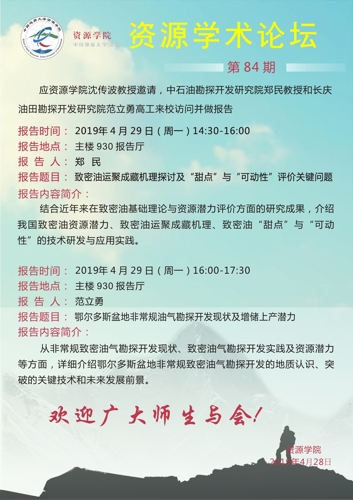 [4月29日]资源学术论坛:中石油勘探开发研究院郑民教授和长庆油田勘探开发研究院范立勇高工学术报告