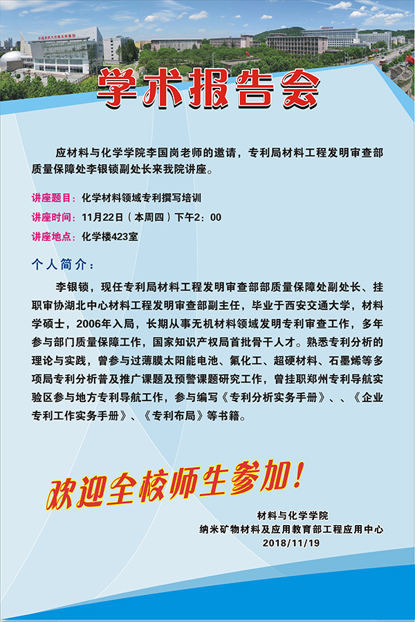 [11月22日]材化学术论坛:专利局材料工程发明审查部质量保障处李银锁副处长学术报告