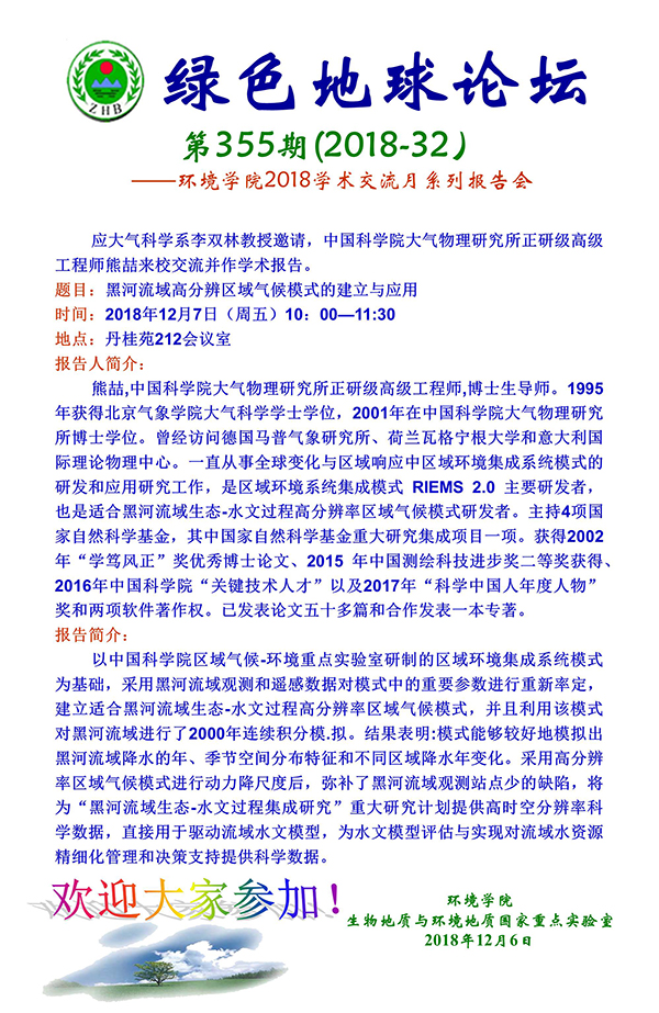 [12月7日]绿色地球论坛:中国科学院大气物理研究所正研级高级工程师熊喆学术报告