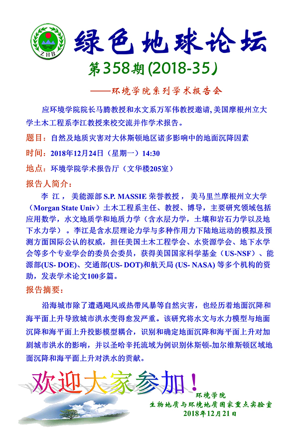 [12月24日]绿色地球论坛:美国摩根州立大学土木工程系李江教授学术报告