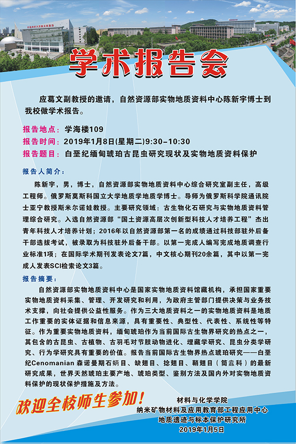 [1月8日]材化学术论坛:自然资源部实物地质资料中心陈新宇博士学术报告