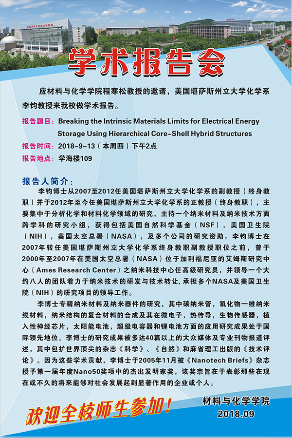 [9月13日]材化论坛:美国堪萨斯州立大学化学系李钧教授学术报告