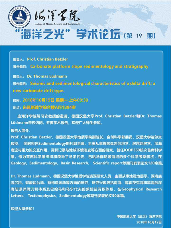[10月15日]海洋之光学术论坛:德国汉堡大学Prof.Christian Betzler和Dr.Thomas Ludmann学术报告