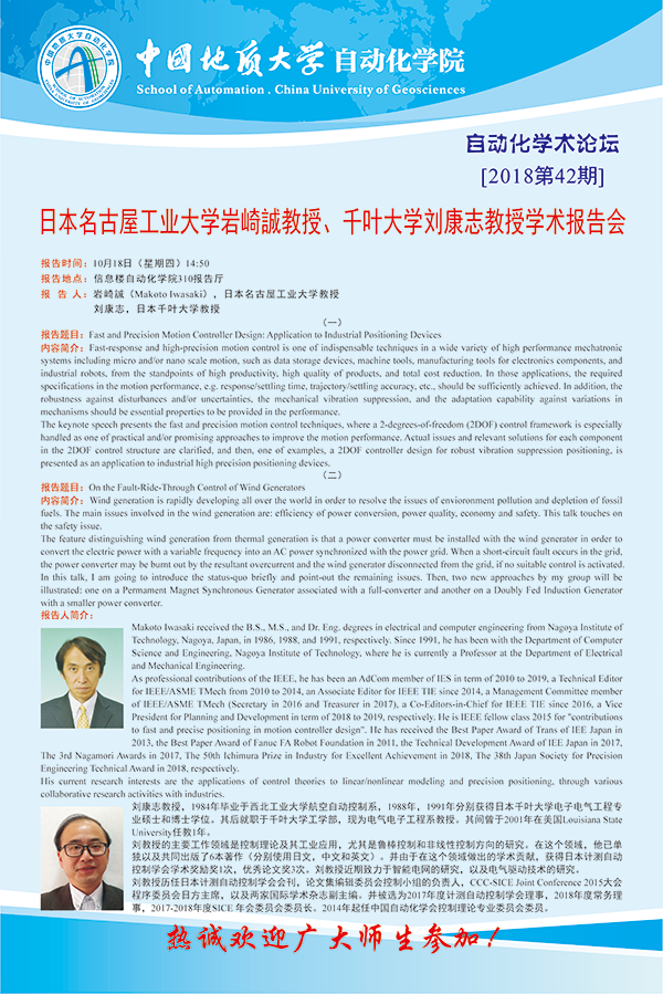 [10月18日]自动化论坛:日本名古屋工业大学岩崎诚教授.千叶大学刘康志教授学术报告